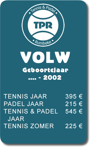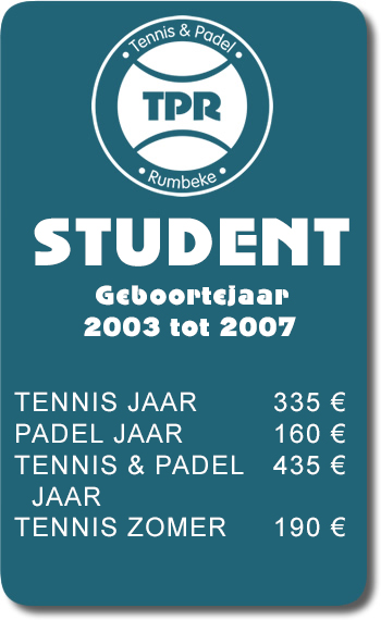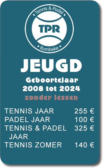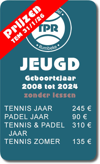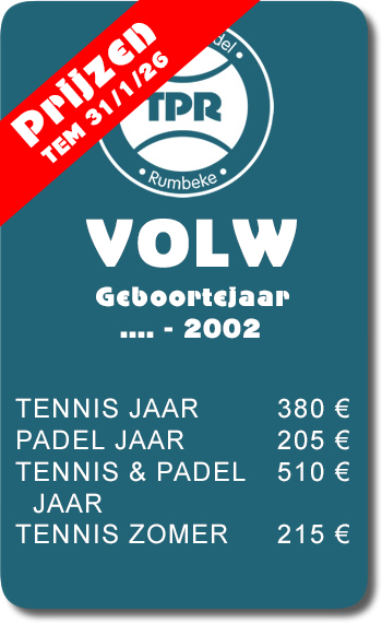 - Tennis & Padel jaar : outdoor en indoor tennis spelen én outdoor padel spelen van 1/04/2026 tem 31/03/2027 (verlichting outdoor tennis tot 30/9/2026)