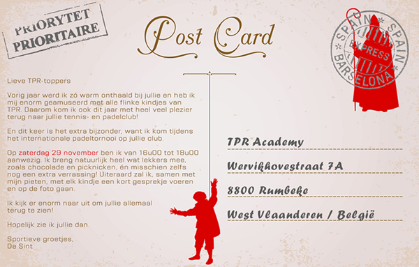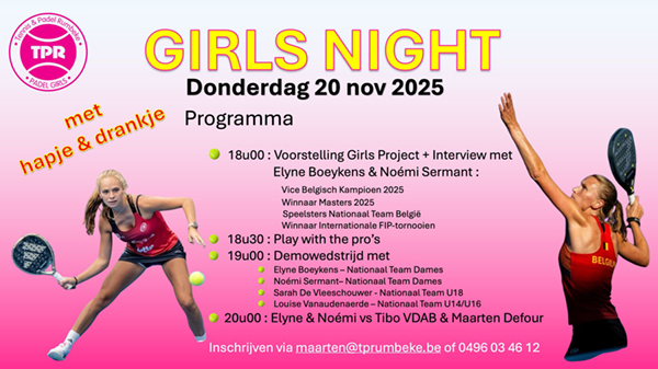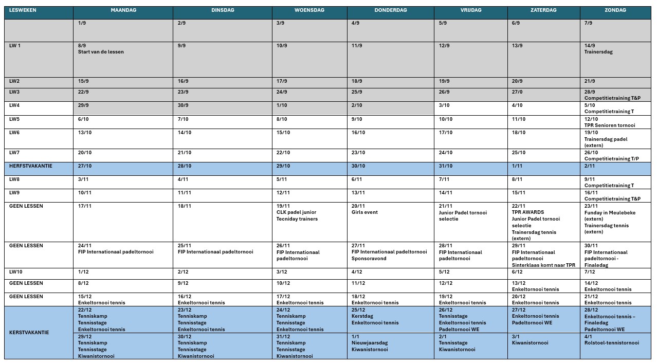 Tussen 17 en 30 november 2025 zijn er geen lessen. Dit komt door het internationaal padeltornooi die plaatsvindt in onze club (FIP). Vóór de start dit event gaan wij eerst nog tal van spelers huldigen op onze TPR Awards op zaterdag 22 november 2025. Ook tijdens het padelevent zelf zijn er tal van activiteiten. Zo organiseren we een groot sponsorfeest = het clubkampioenschap padel voor juniors, hebben we een girlsnight en de Sint komt langs. Ben je fan van ambiance en padel, kom zeker langs! Dit event is volledig gratis.