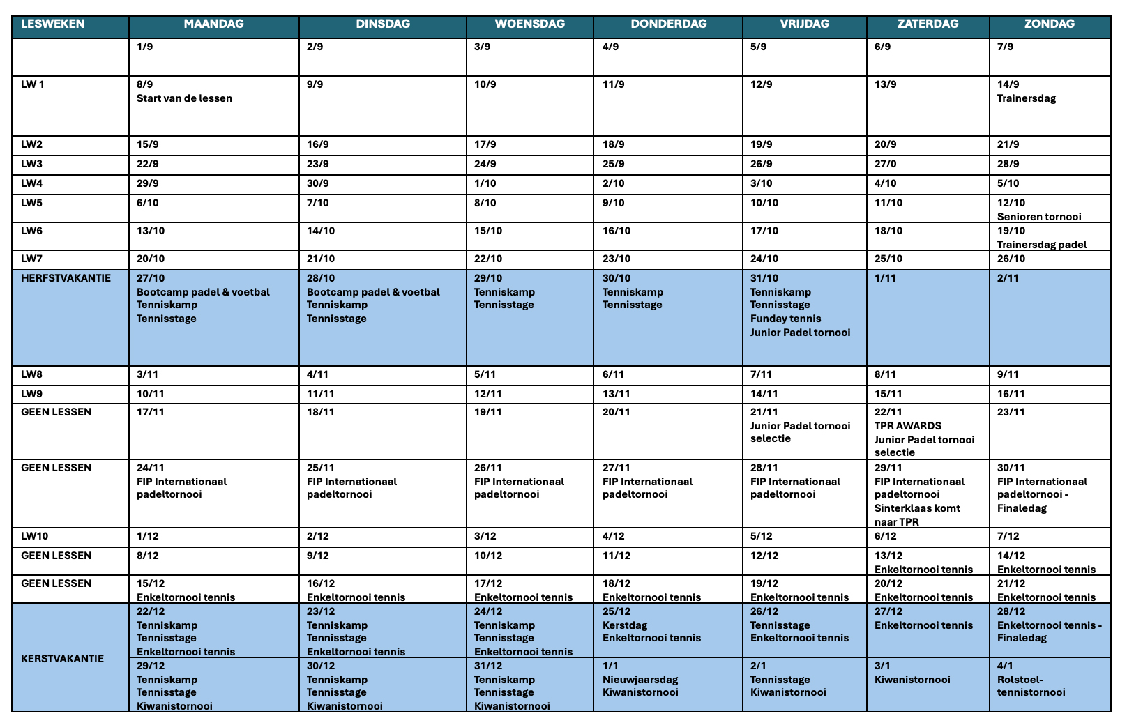 Wist je dat … de tennisstages 2025/2026 al openstaan? Tennisstage zijn speciaal voor competitiespelers, die tijdens die week ook aan een tornooi deelnemen. Vanaf september zijn er elke vakantie stages in TPR, maar de plaatsen zijn beperkt, dus wees er snel bij. Ook de stages padel zullen snel volgen. Inschrijven kan via https://www.tprumbeke.be/academy-stages. Ook de tweedaagse bootcamp padel en voetbal tijdens de herfstvakantie staat open via www.dejongevoetballer.be